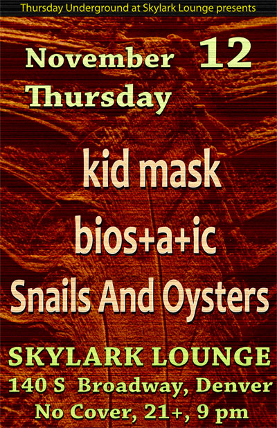 Greetings from symbolic insight for November 2015. This Thursday night (Nov. 12) bios+a+ic will be joined by drummer, Joe Soric, for a live set a the Skylark Lounge with kid mask and Snails And Oysters. bios+a+ic hosts KGNU's Sleepless Night on 4th Fridays, this month presenting the Muslimgauze Tribute 3.0, which he will play 3 hours of music from the artist. Last Sunday brings textures ambient showcase on the 29th with a rare solo performance by bahiya as well as MINGO and Mondo Obscura at the Mutiny Information Cafe. We would love to see you at an upcoming event!