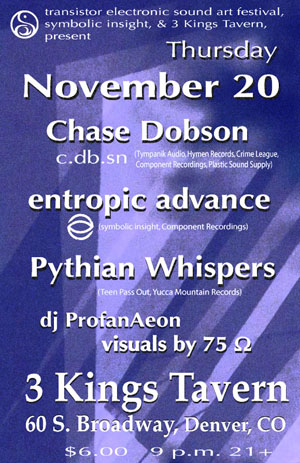 Greetings from symbolic insight! This month, we cordially invite you to our showcase on November 20 at Three Kings Tavern in Denver, also presented by transistor electronic sound art festival. This show features Chase Dobson (c.db.sn) & entropic advance, both performing new material for their only 2014 club appearance. We also have Pythian Whispers joined by Victoria Lindy, dj ProfanAeon, & the debut of visual art project, 75 O. We continue textures ambient showcase on last Sundays monthly at the Mutiny and bios+a+ic hosts Electronic Air & Sleepless Nights on KGNU.