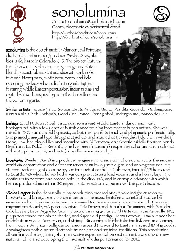 ![]() | "Solar Logos" is the debut album by sonolumina created at symbolic insight studios by bios+a+ic and bahiya over a six year period. The music features a variety of source by musicians which was reworked and processed to create a new innovative sound. The core rhythms are Washington percussionists, Erik Brown and Jonathan Brummett, with Boulder, CO, bassist, Leon Arguello. Grammy award winning guitarist, Al Petteway from Asheville, NC, plays handmade banjola on "hado", and 6 year old prodigy, Terra Petteway Davis, makes her cd debut on vocals, accordion, and strings. Nine unique tracks take the listener on a journey from modern American belly dance fusion around the world to Eastern inspired IDM grooves, drawing from both current electronic trends and ancient tribal traditions. This sonolumina album marks the beginning of an innovative experimental project currently working on new material, while also developing their live multi-media performance for 2012. view the one sheet |